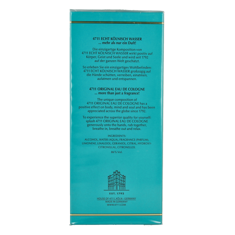 De originele cojpositie van 4711 Original Eau de Cologne heeft een positief effect op lichaam, geest en ziel en wordt al wereldwijd gebruikt sinds 1792