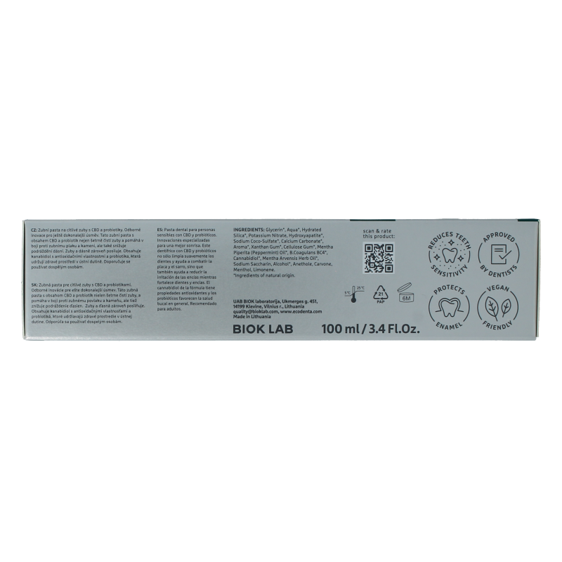 Tandpasta voor gevoelige tanden met CBD en probiotica. Deskundige innovaties voor een nog betere glimlach. Deze tandpasta met CBD en probiotica reinigt niet alleen reinigt je tanden op milde wijze en helpt tandplak en tandsteen te bestrijden, maar helpt ook tandvleesirritatie te verminderen en versterkt tanden en tandvlees. De cannabidiol in de formule heeft antioxiderende eigenschappen en de probiotica ondersteunen de algehele mondgezondheid. Aanbevolen voor volwassenen.