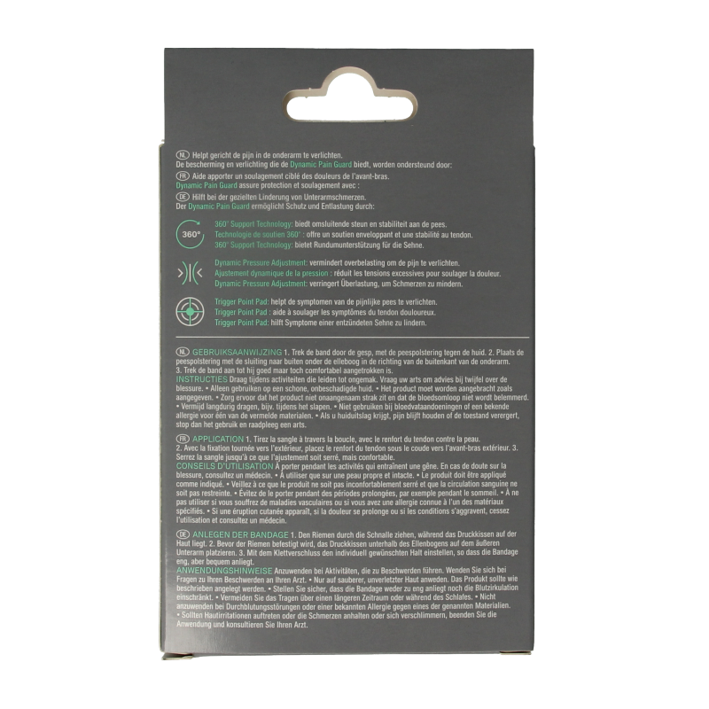 De tenniselleboogbandage is ontworpen om te dragen tijdens fysieke beweging of sport. Vermijd langdurig dragen van de bandage, bijvoorbeeld tijdens het slapen. Er moet voor worden gezorgd dat het product niet onaangenaam strak zit en de bloedsomloop niet wordt belemmerd. Bovendien zijn de bandages niet bedoeld om te immobiliseren, maar om te dragen tijdens activiteit om het positieve effect op het lichaam en het genezingsproces mogelijk te maken. Voor meer informatie over de instructies, zie het gedeelte "Instructies".