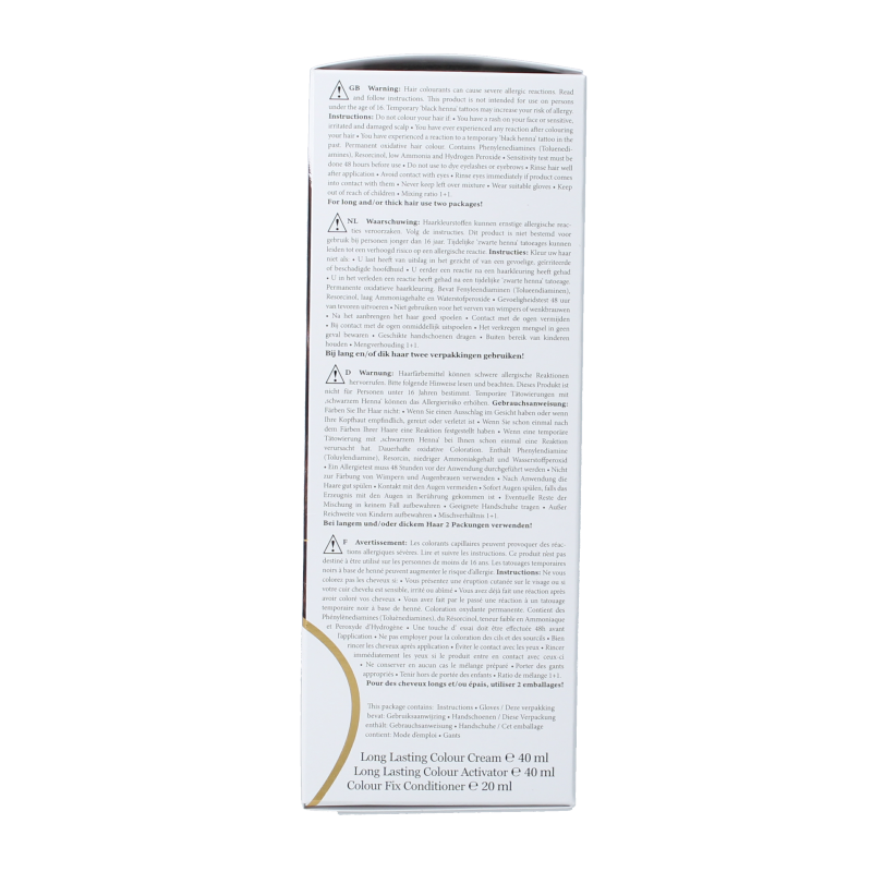 Voer iedere keer dat u uw haar kleurt, 48 uur voor de toepassing een allergie-test uit, ook wanneer al eerder haarkleurproducten zijn toegepast. De test op ca. 1 cm x 1 cm huidoppervlak in de elleboog uitvoeren. Een beetje kleurcrème (tube) met een wattenstokje dun aanbrengen in de elleboog en 45 minuten onbedekt laten inwerken. Tube goed sluiten. Na 45 minuten het product grondig met water van de huid afwassen.