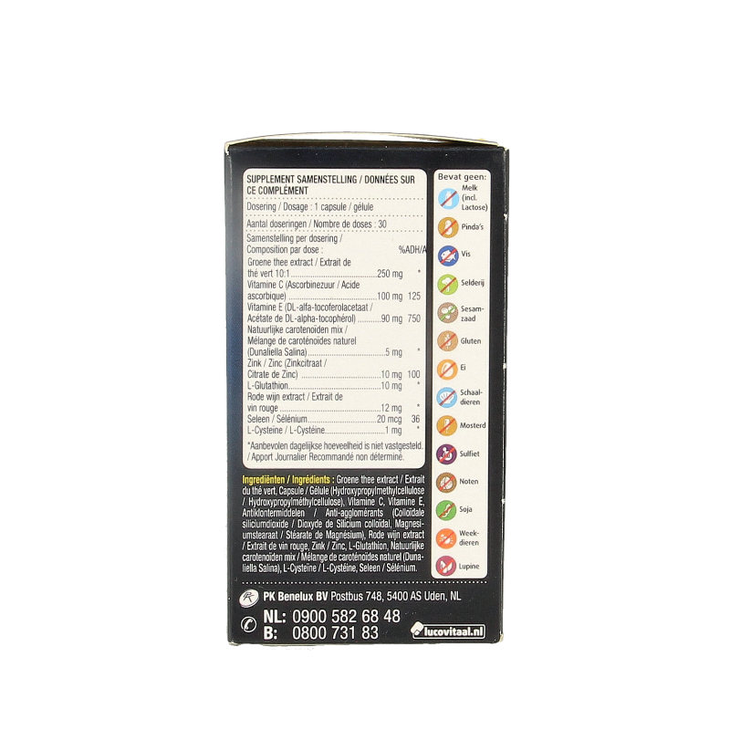 Lucovitaal Antioxidant Complex bevat groene thee, vitamine C, vitamine E, zink en seleen. De formule bevat tevens Dunaliella Salina, L-Glutathion, Rode wijn extract en L-Cysteïne.