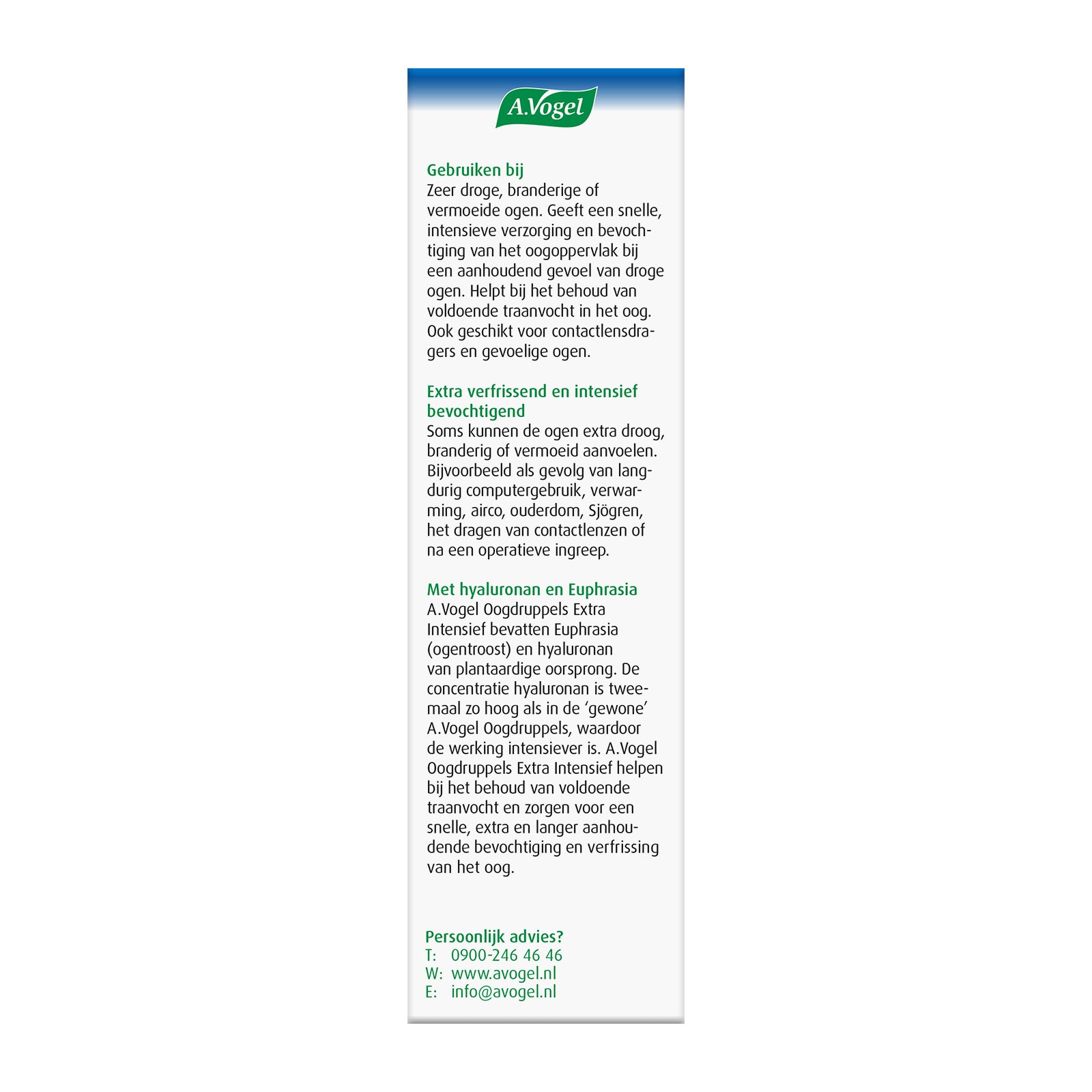 Volwassenen: naar behoefte tot maximaal 5x daags in beide ogen 1 druppel. A.Vogel Oogdruppels extra intensief mogen niet langer dan 30 dagen aaneengesloten gebruikt worden. Als na 3 dagen gebruik geen verbetering optreedt of uw klachten verergeren of wanneer de ogen ontstoken raken, neemt u dan contact op met uw huisarts.Kinderen vanaf 12 jaar: 1-2x daags in beide ogen 1 druppel, nadat een arts is geraadpleegd. A.Vogel Oogdruppels extra intensief kan bij kinderen vanaf 12 jaar gebruikt worden, mits vooraf door een huisarts is vastgesteld dat de oogproblemen niet een andere medische behandeling vereisen. De maximale gebruiksduur bij kinderen dient te worden vastgesteld door een arts, maar deze mag de 30 dagen niet overschrijden.