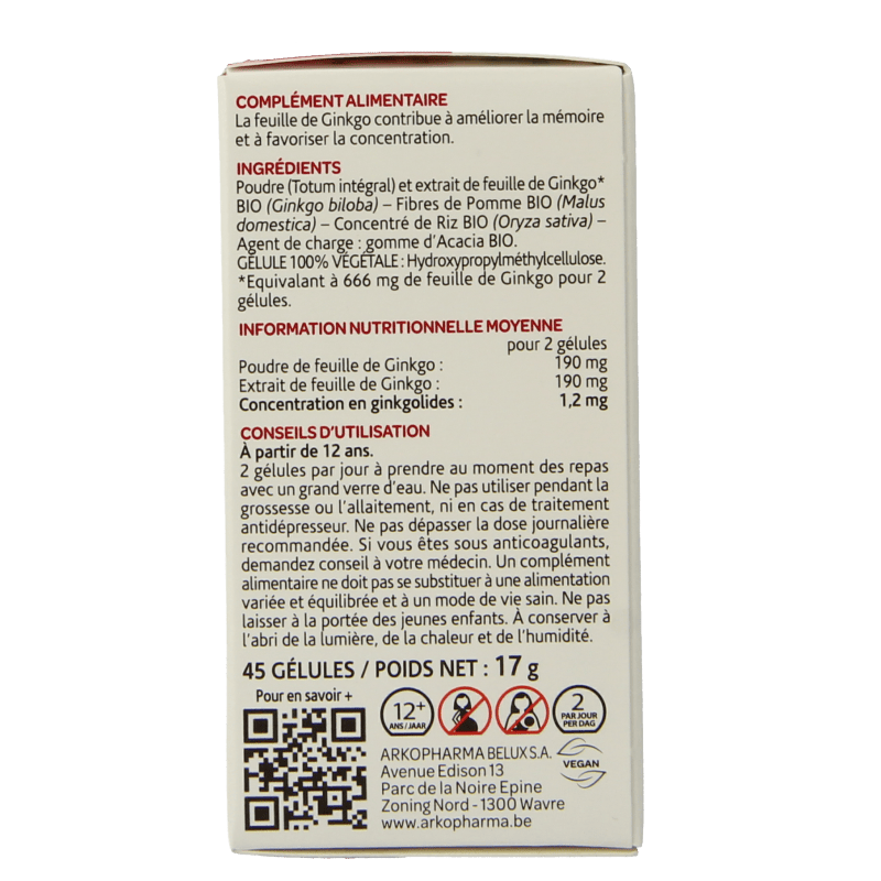 Poeder (integraal totum) en extract van het blad van BIO Ginkgo* (Ginkgo biloba), BIO Appelvezels (Malus domestica), BIO Rijstconcentraat (Oryza sativa), vulstof: BIO Acaciagom, capsule 100% plantaardig: hydroxypropylmethylcellulose. *Equivalent aan 666mg van het blad van Ginkgo voor 2 capsules
