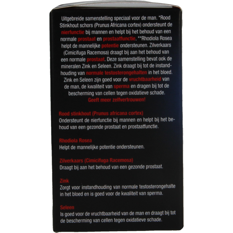 Vulmiddel (Aardappelzetmeel), Rhodiola Rosea extract, Rood Stinkhout schors, Zilverkaars, Zink, Verdikkingsmiddel (Zonnebloemolie), Seleen, Capsulehuls (HPMC).