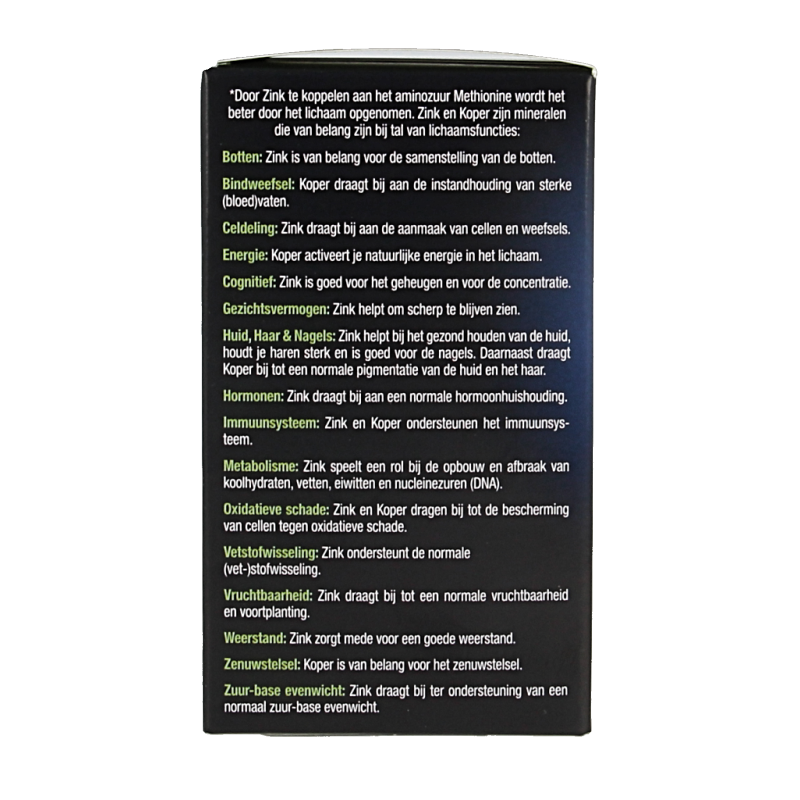 Zink en Koper zijn mineralen die van belang zijn bij tal van lichaamsfuncties. Zink is onder andere belangrijk voor sterke botten, extra energie, geheugen en concentratie, gezond haar, gezonde nagels en een gezonde huid, de hormoonhuishouding een normale vruchtbaarheid en voortplanting en het immuunsysteem. Daarnaast speelt Zink een belangrijke rol bij de opbouw en afbraak van koolhydraten, vetten, eiwitten en nucleïnezuren (DNA). Zink en Koper zijn antagonisten van elkaar en worden daarom bij voorkeur in combinatie ingenomen. Zink, Methionine & Koper van Lucovitaal is een uitgekiende samenstelling met zeer goede verbindingen voor een snelle en goede opname door het lichaam.